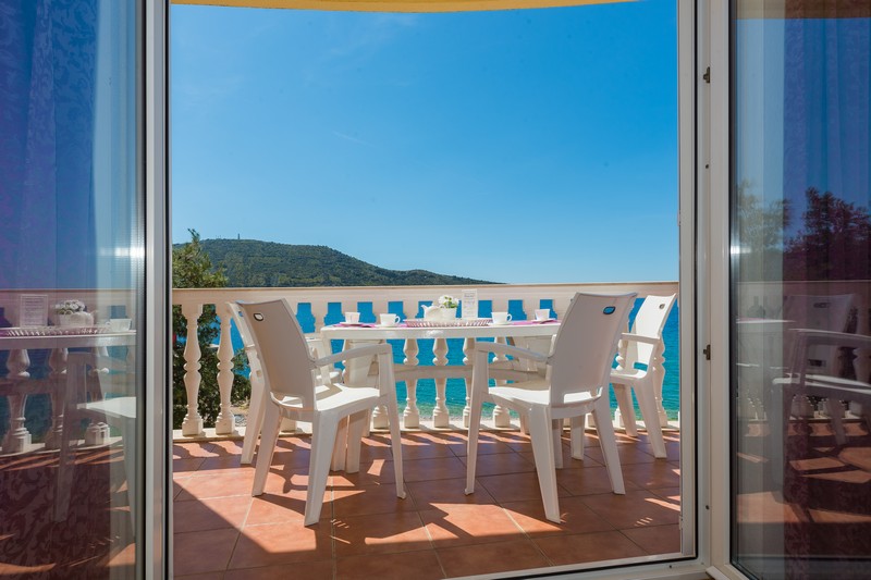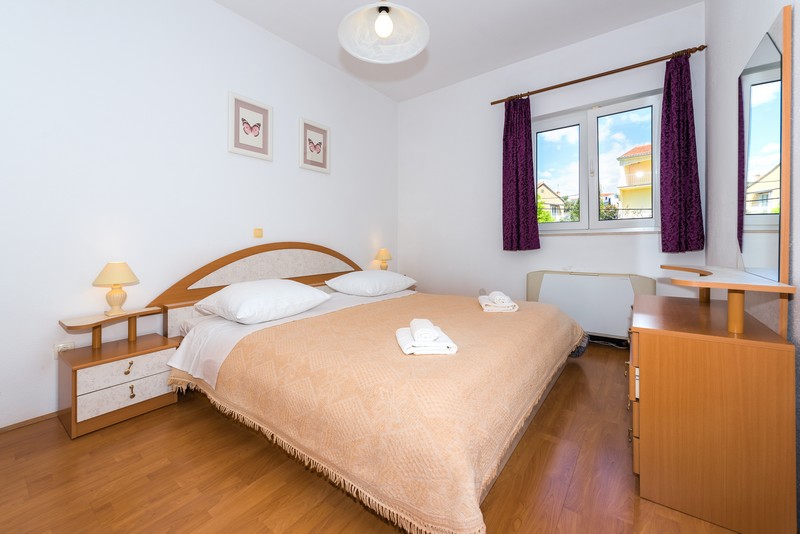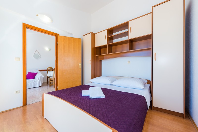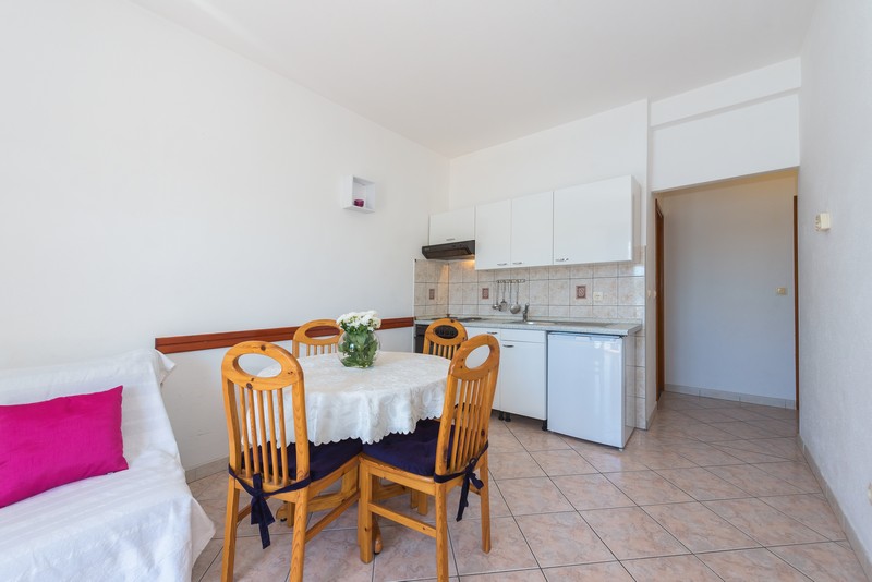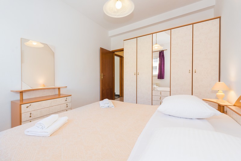 Ferienwohnung 4+1 befindet sich im ersten Stock und besteht aus zwei Schlafzimmern, einem Wohnzimmer mit Schlafsofa für eine Person (160x200), einer Küche, einem Badezimmer und einem Balkon mit Meerblick. Die Küche ist mit Koch- und Serviergeschirr ausgestattet.