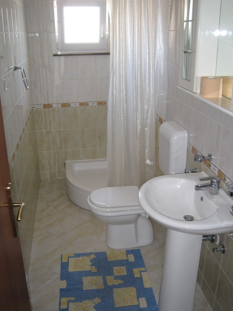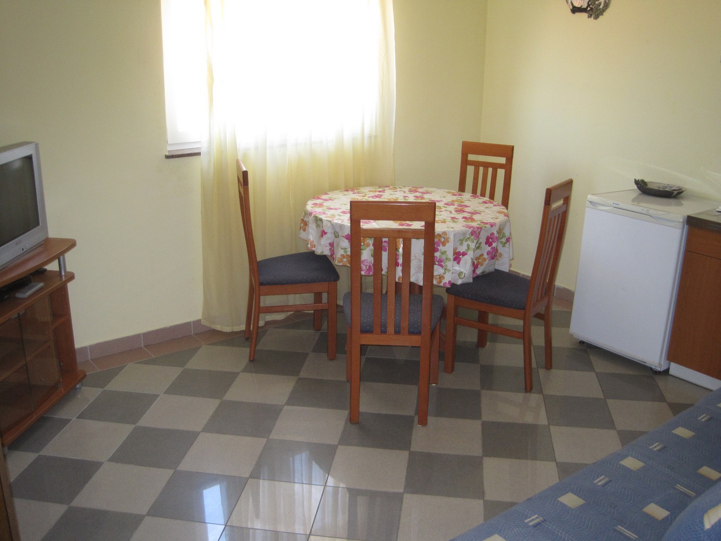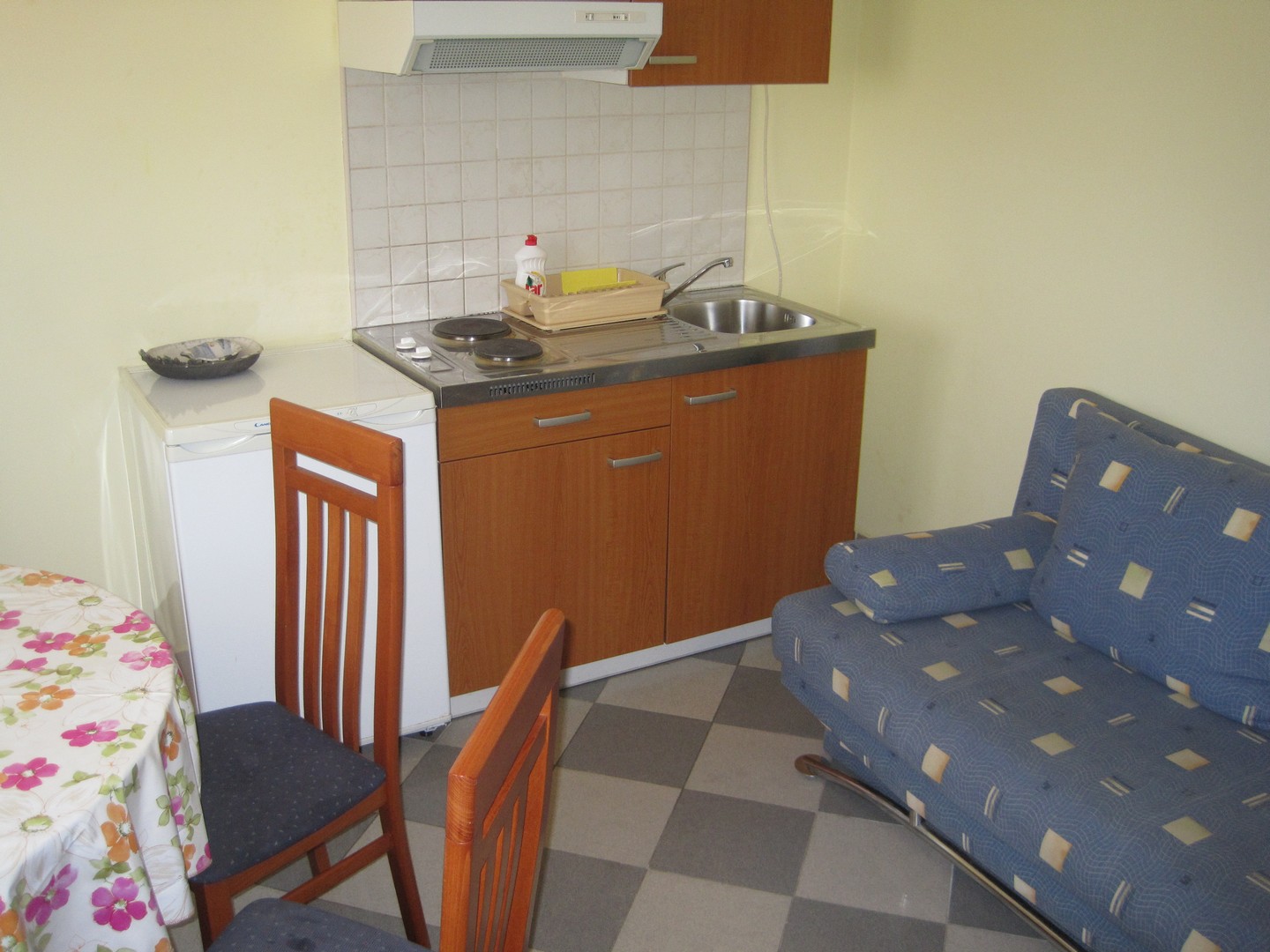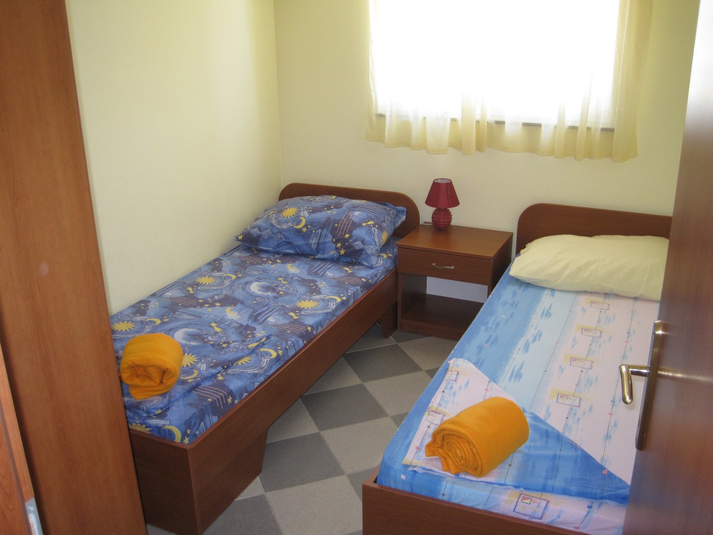 Chambre à coucher avec deux lits simples, salle de séjour avec canapé-lit, cuisine, salle de bain avec WC, climatisation, TV, wi-fi, place de parking