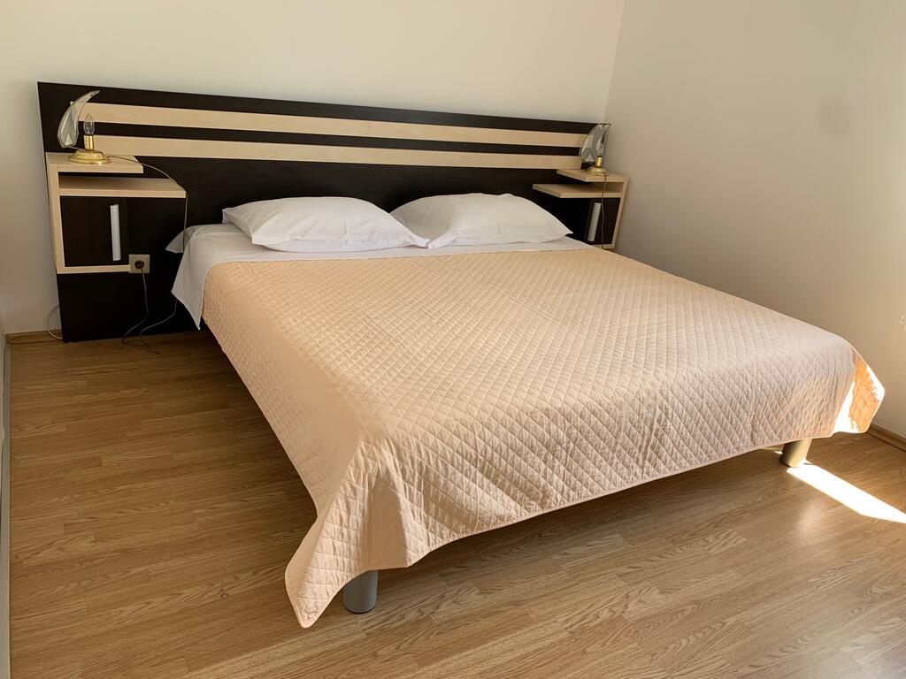 deux chambres séparées avec lits doubles, salle de séjour avec lit supplémentaire, cuisine, salle de bain avec WC, terrasse, climatisation, TV, wi-fi, au premier étage, parking
