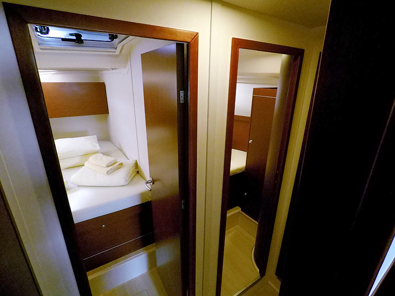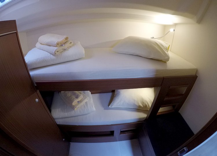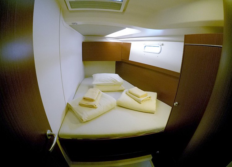 4 kabine s bračnim krevetom i jedna kabina s bračnim krevetima. Imaju 3 kupaonice s tušem + skiper WC.