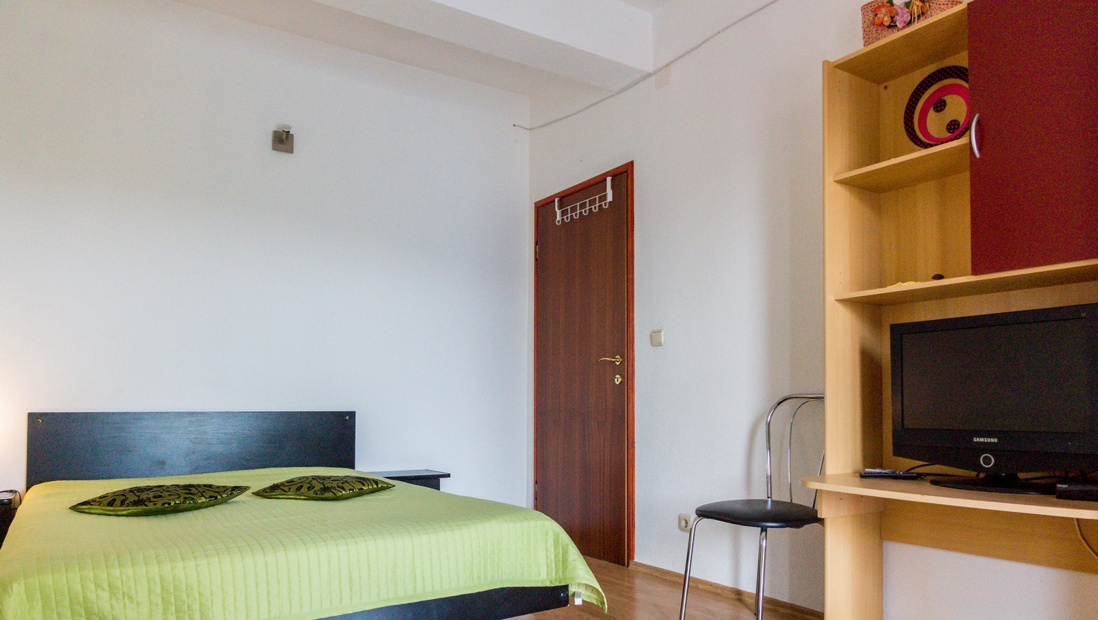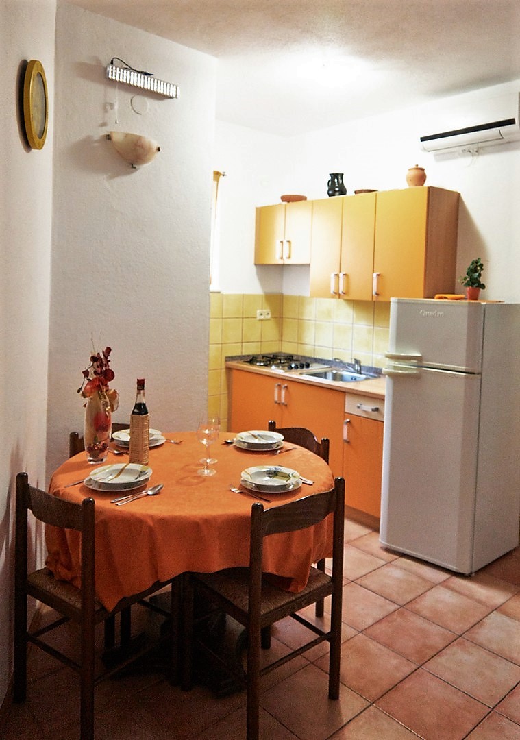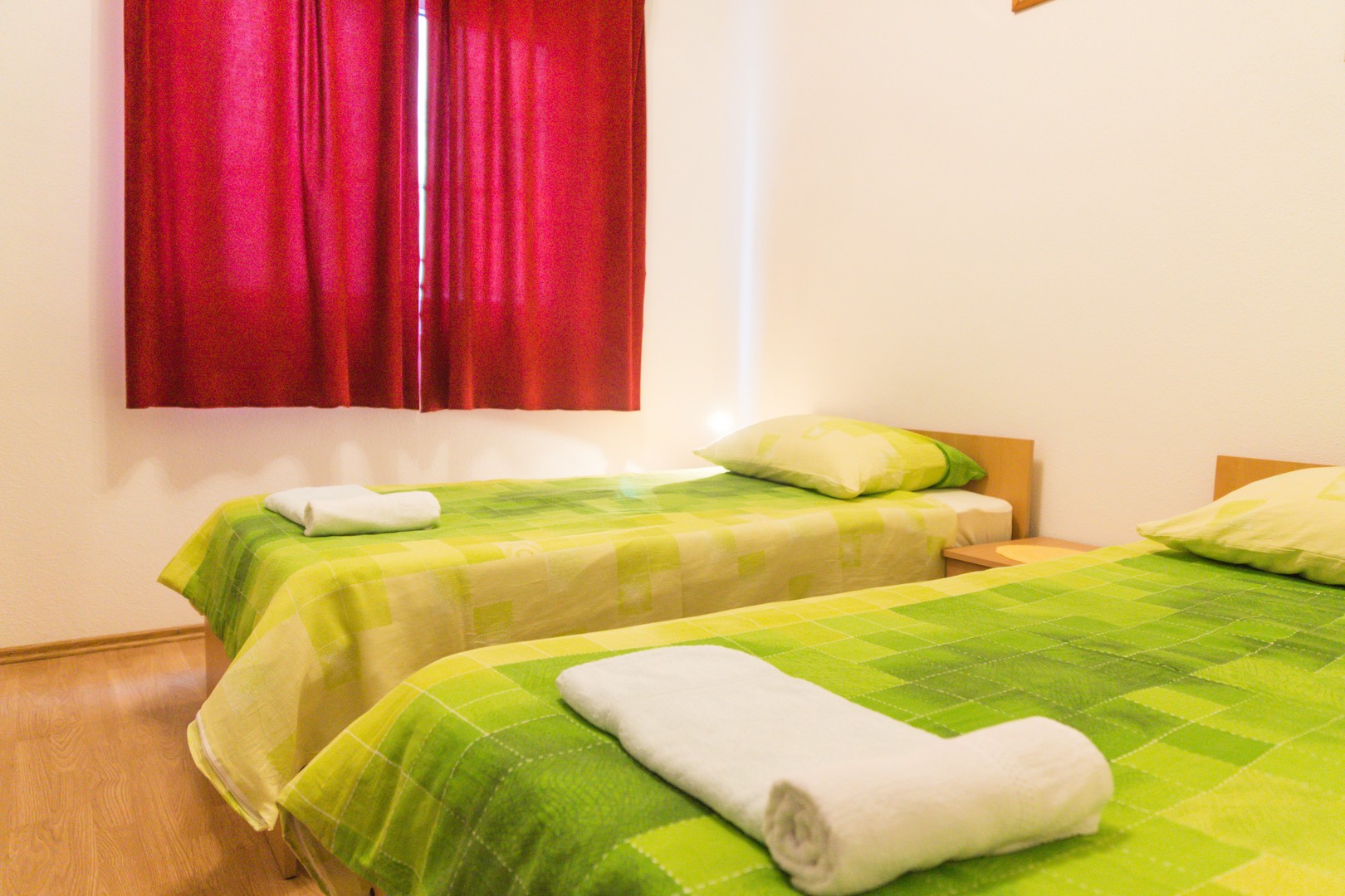 65m2; dvije spavaće sobe od kojih prva sadrži bračni krevet i kauč na rasklapanje, a druga dva kreveta za po jednu osobu; kuhinja s blagovaonicom, kupaonica s WC-om, balkon s pogledom na more (izlaz na balkon je moguć samo iz prve spavaće sobe), klima uređaj, Sat-TV, wi.fi, prvi kat, parkirno mjesto
