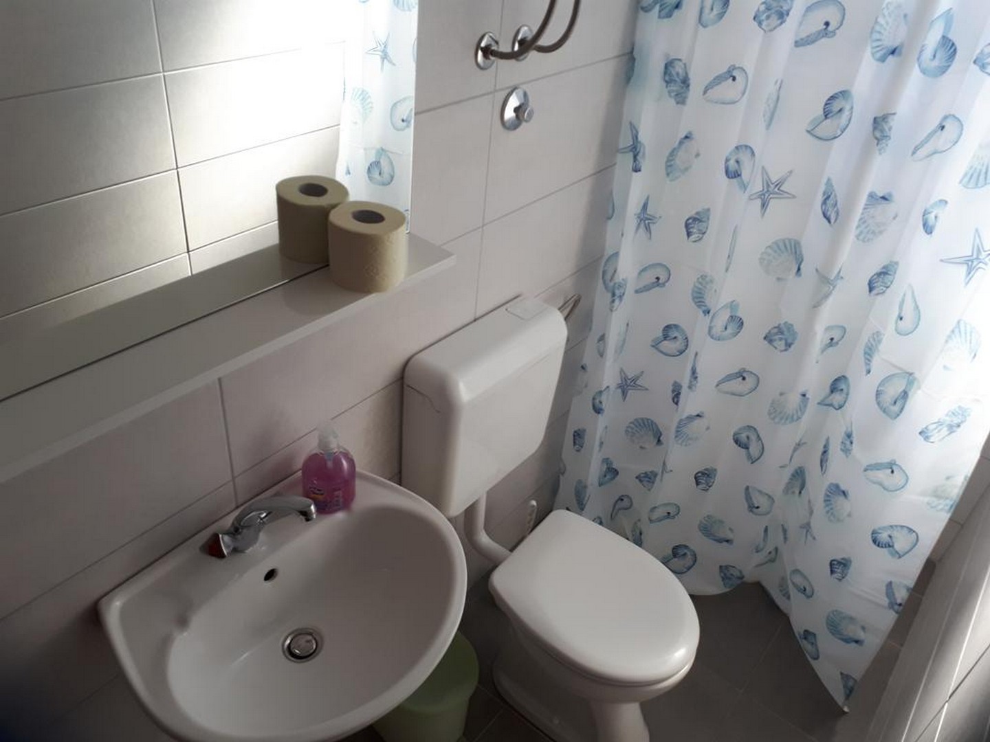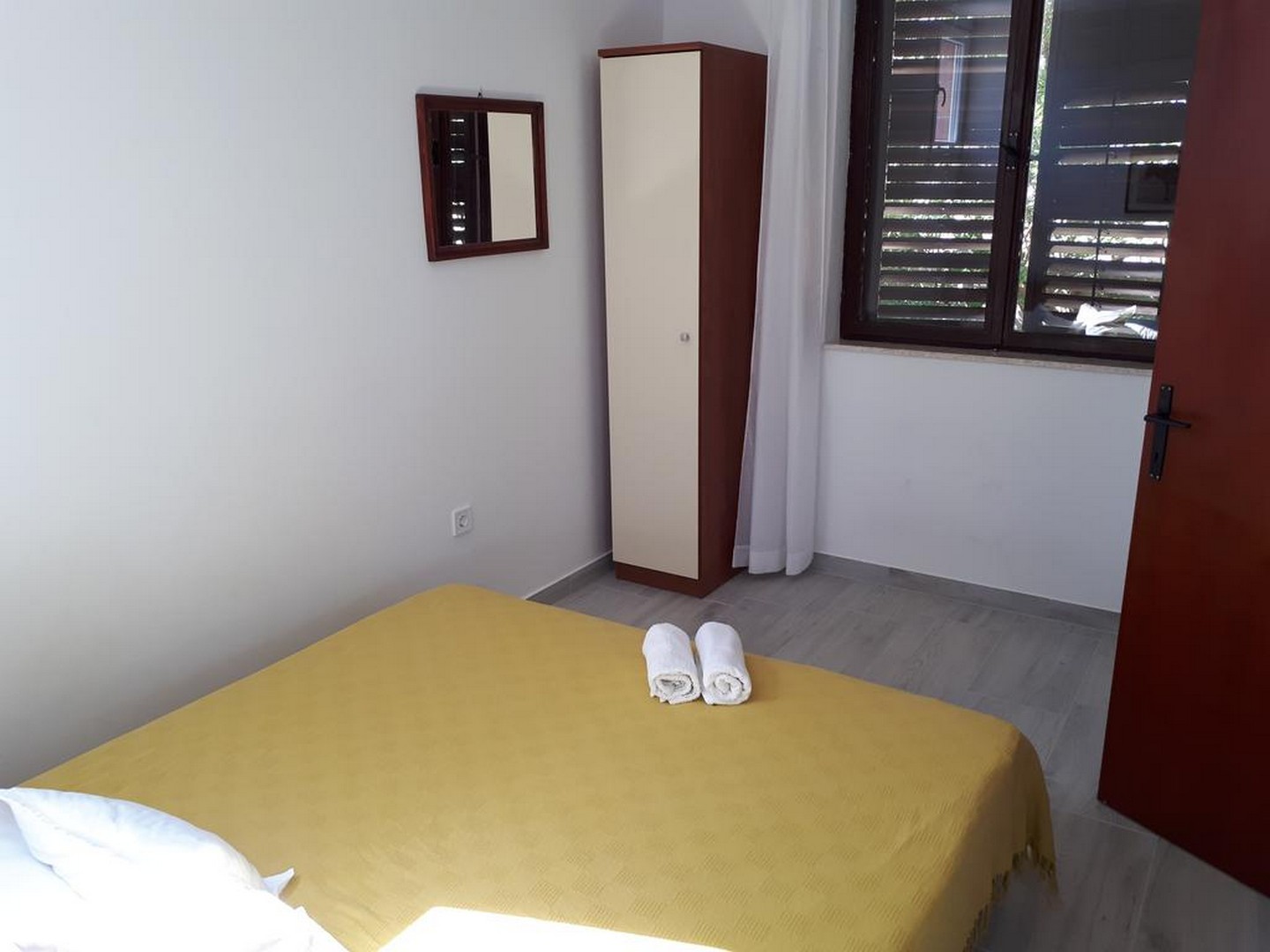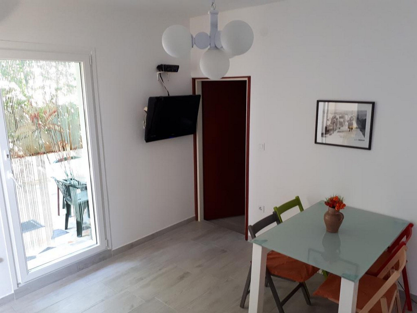 Appartamento con terrazza ca. 200 m dal mare e ca. 300 m dal centro di Primošten, due camere da letto con letti matrimoniali, cucina, bagno con wc, aria condizionata, TV satellitare, Wi-Fi, piano terra, parcheggio