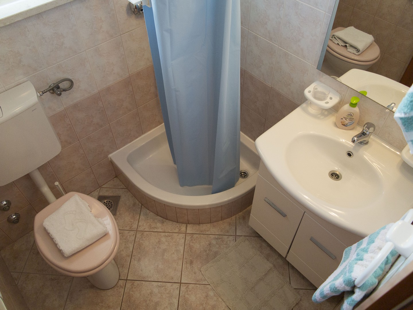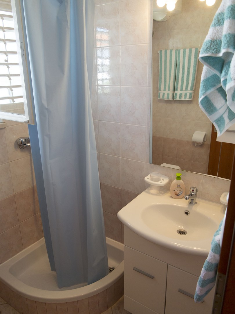 Monolocale di 25m² per due persone - ca. 250 metri dal mare e ca. 300 m dal centro di Primošten, camera, cucina, bagno con wc, balcone, aria condizionata, Sat-TV, Wi-Fi, parcheggio