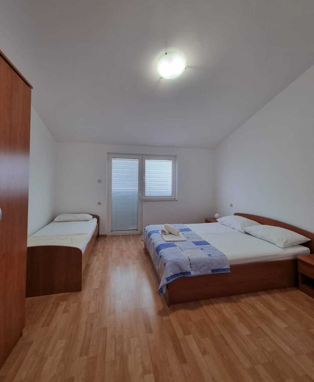 70m²; due camere da letto con letti matrimoniali, una con un letto singolo aggiuntivo; Cucina con sala da pranzo, bagno con WC, balcone, aria condizionata, TV satellitare, internet wireless, secondo piano, parcheggio