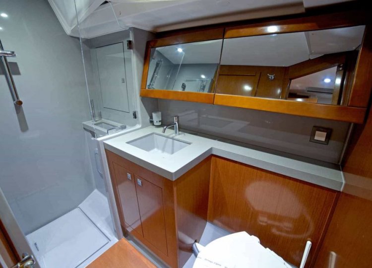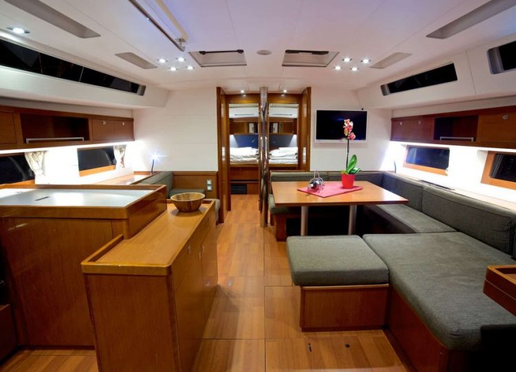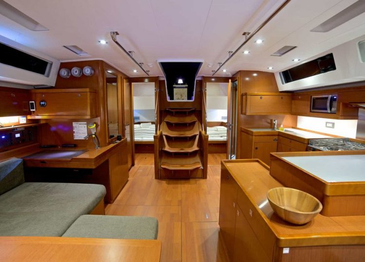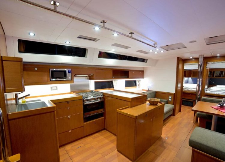 Wnętrze charakteryzuje się wieloma otworami, które sprawiają, że kuchnia jest świeża, jasna i pojemna, dobrze wyposażona w nowatorskie rozwiązania projektowe, przyjazna i niezwykle komfortowa. Cztery kabiny główne plus kabina sternika, każda z własną łazienką, dają poczucie spokoju, chłodu i ciszy. Specjalne zaproszenie do relaksu to cztery duże miejsca do opalania wraz z tylną platformą, która zamienia się w taras nad wodą.