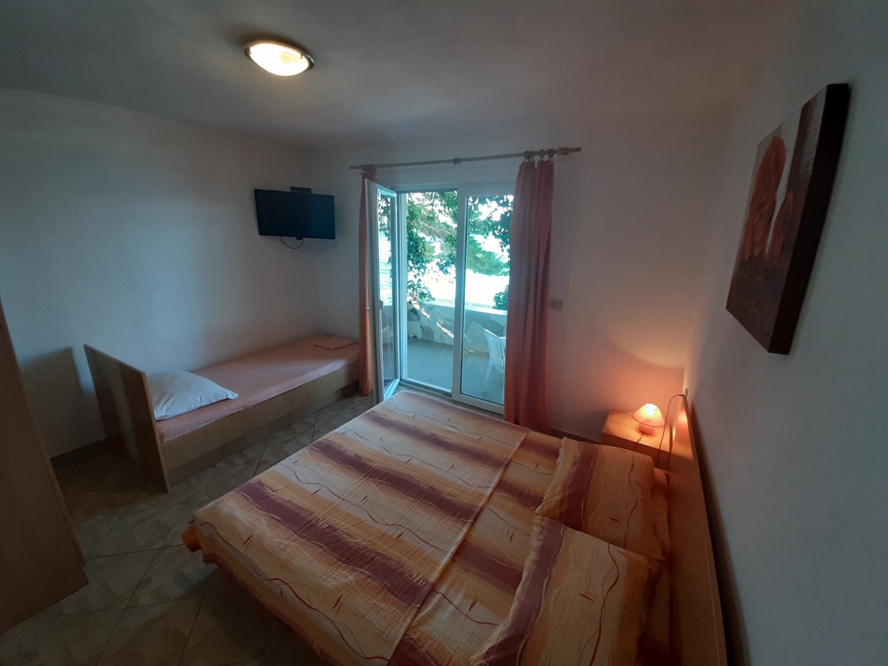 Apartament z oddzielną sypialnią z łóżkiem podwójnym i pojedynczym oraz pojedynczym łóżkiem w salonie.