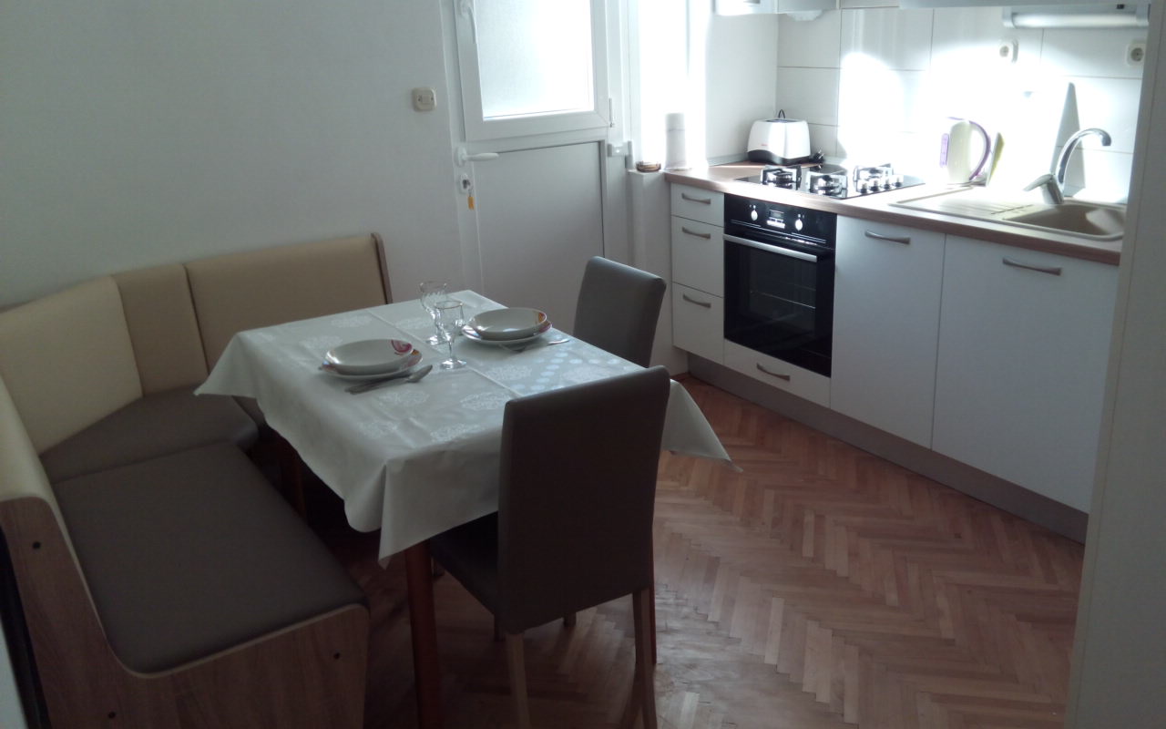 Dwie oddzielne sypialnie z podwójnymi łóżkami, pokój dzienny z rozkładaną sofą, kuchnia z jadalnią, łazienka z WC, dwa balkony, klimatyzacja, TV, WiFi, parter, parking