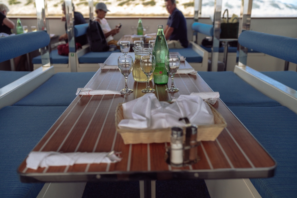 • Mittagessen an Bord (Kalbfleisch vom Grill mit gebackenen Kartoffeln, Salat der Saison oder Weißfisch vom Grill mit gekochten Kartoffeln, Salat der Saison)