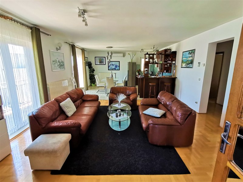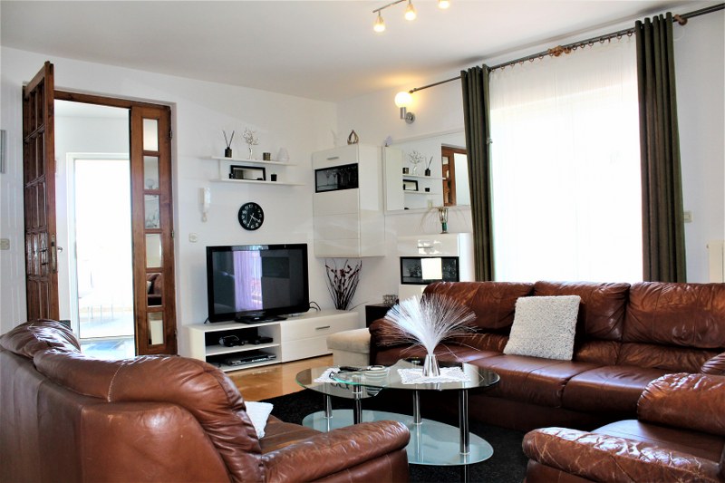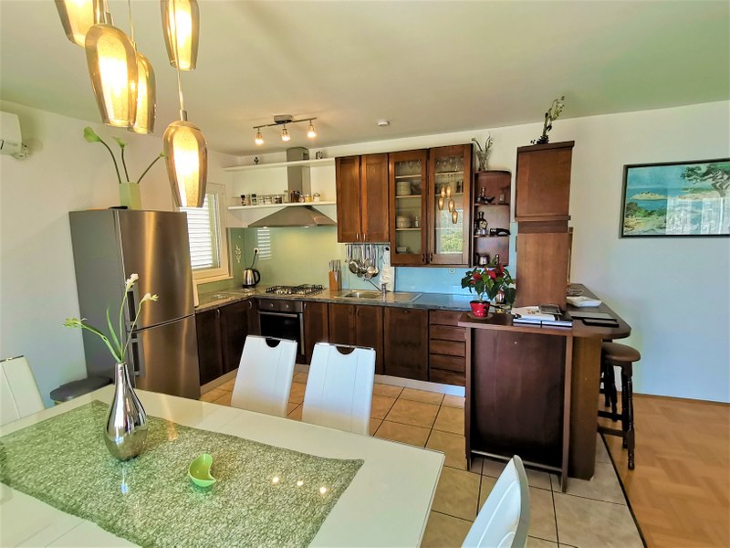 Die Wohnung besteht aus drei Schlafzimmern, einem großen Wohnzimmer, Küche mit Herd, Kühlschrank, Geschirr. Draußen gibt es eine schöne Terrasse mit Sitzgelegenheiten und Meerblick.