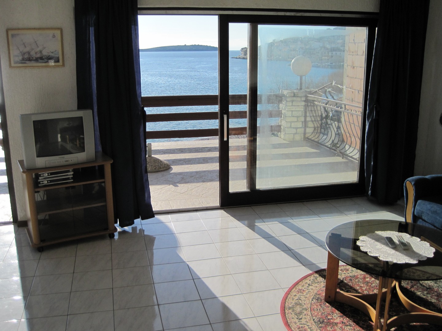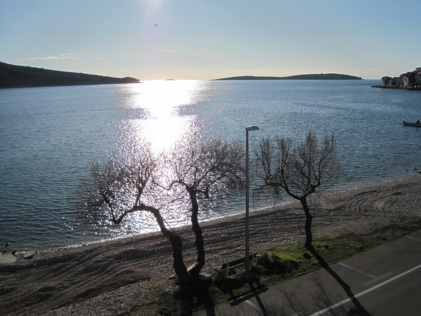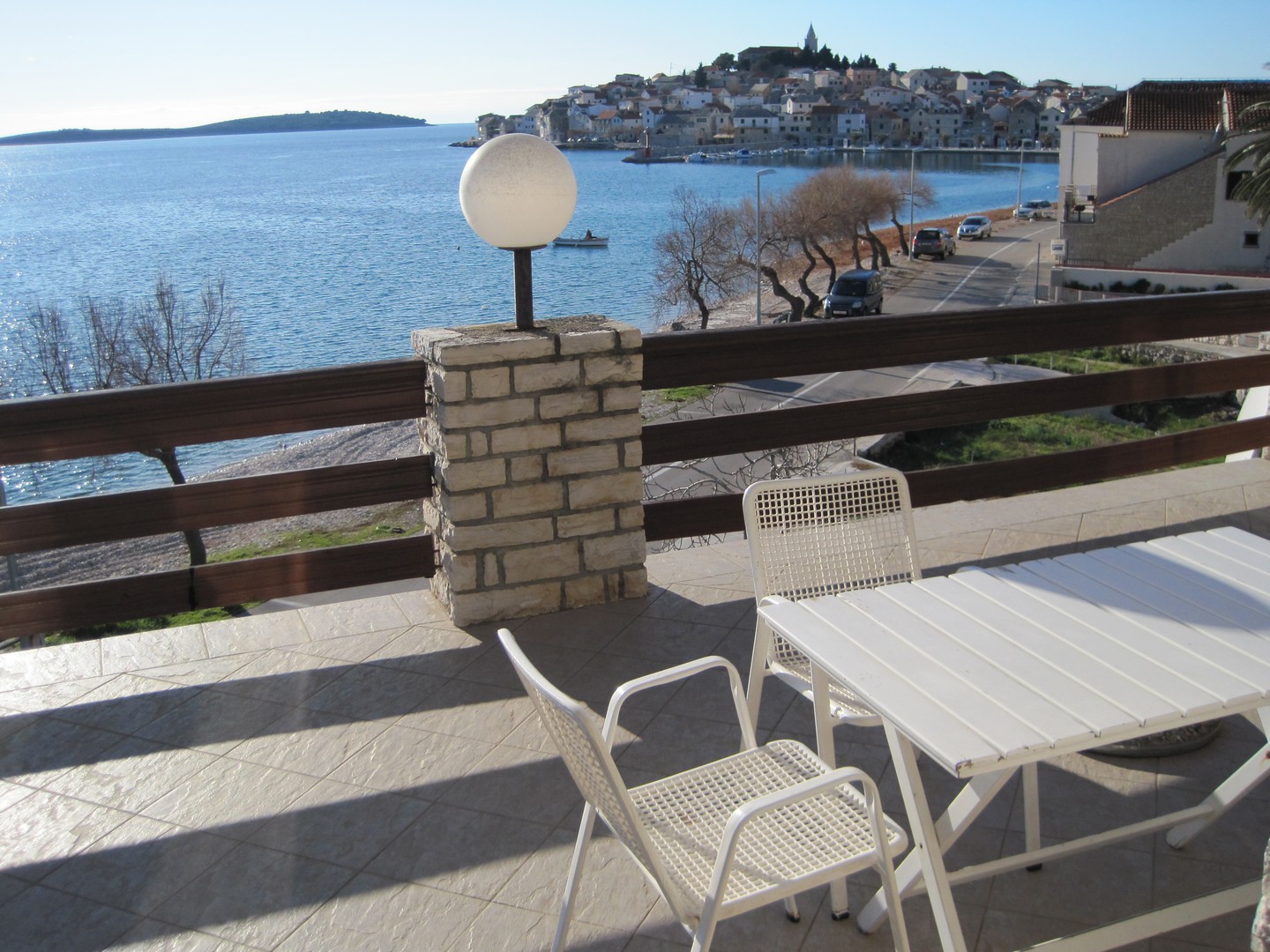 10 m vom Meer und Strand entfernt, große Terrasse mit Meerblick und Primošten, Küche, 3 Schlafzimmer jeweils mit Doppelbett und mit eigenem WC-Badezimmer, Zusatzbett für zwei Personen im Wohnzimmer, Klimaanlage, SAT-TV, zweiter Stock, Parkplatz