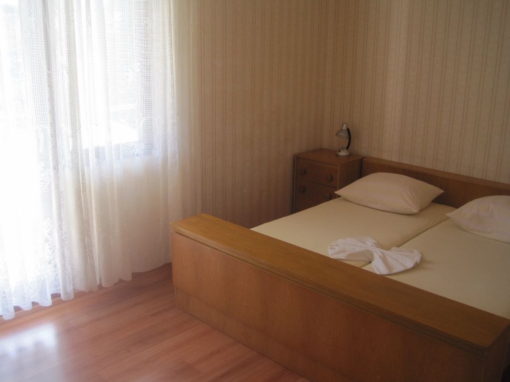 Zwei Schlafzimmer, eines mit einem Doppelbett und das andere mit zwei Einzelbetten, Küche mit Essbereich und Wohnzimmer mit Schlafsofa, Bad mit WC, Balkon, Klimaanlage, TV, WLAN, Grill im Freien, Erster Stock, Parkplatz