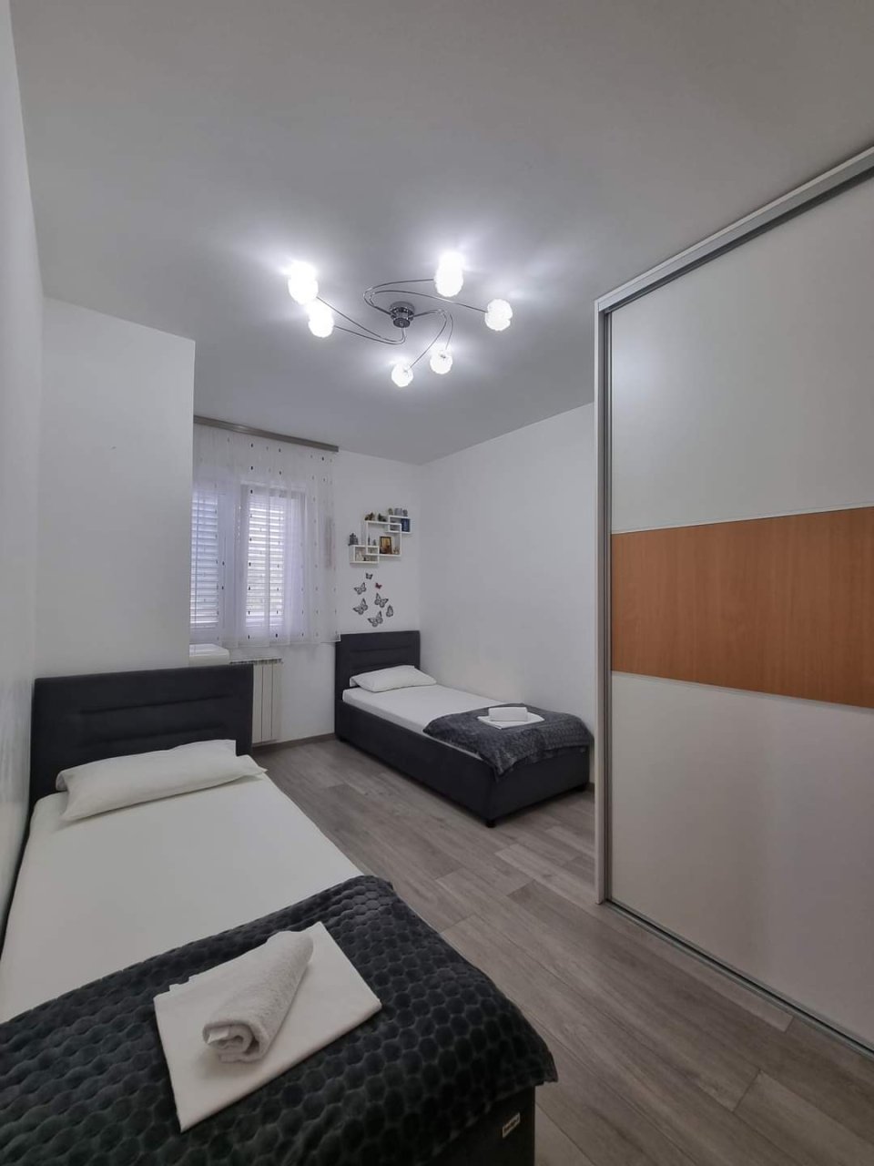 85m²; zwei Schlafzimmer, eins mit einem Doppelbett und das andere mit zwei Einzelbetten; Wohnzimmer mit Schlafcouch, Küche mit Essbereich, Badezimmer mit WC, separates WC, Balkon, Klimaanlage, Sat-TV, WLAN, erster Stock, Parkplatz