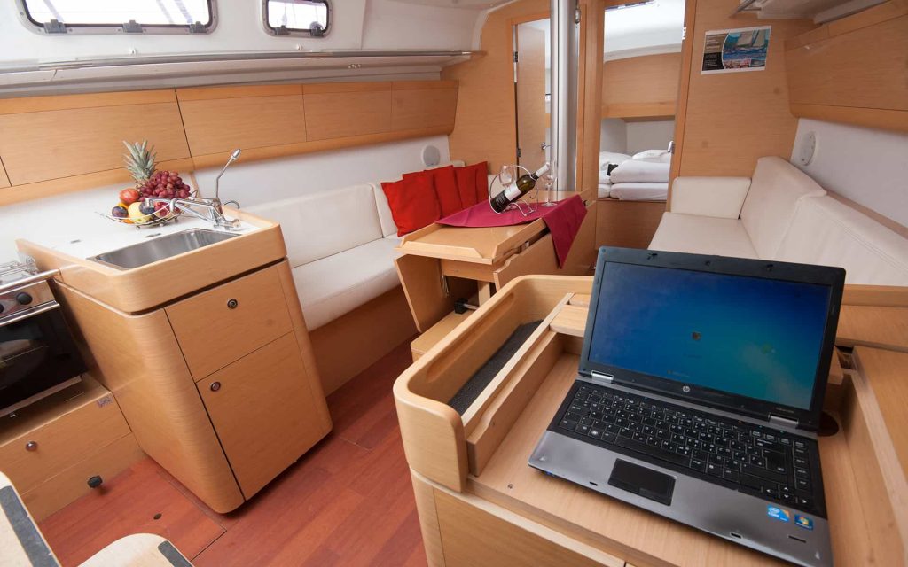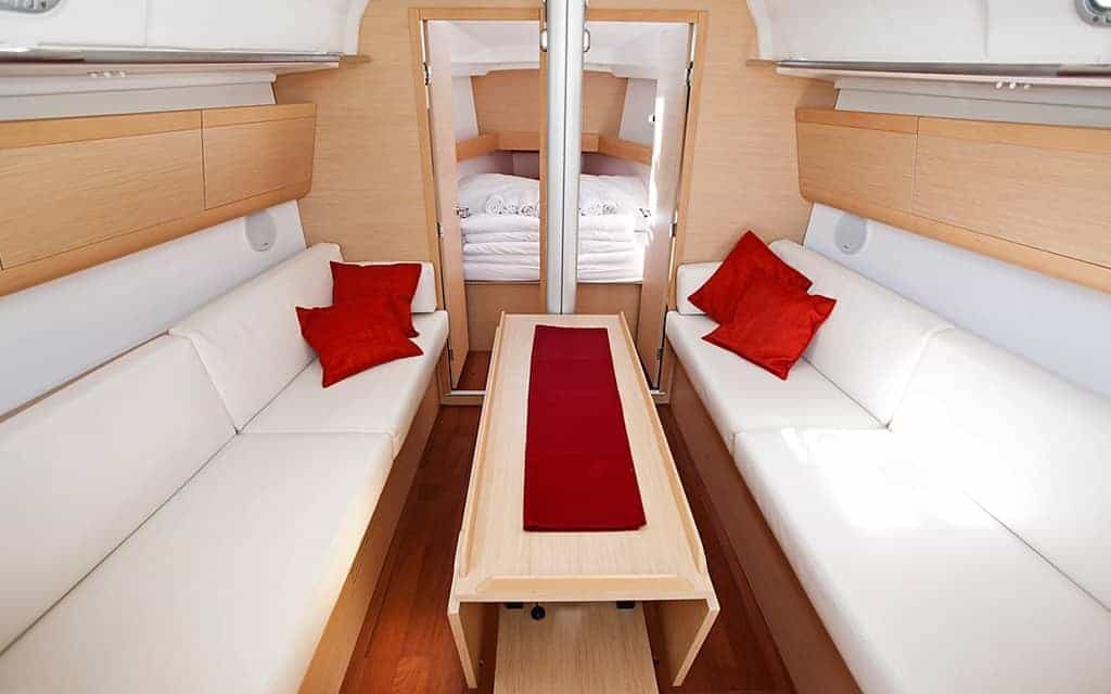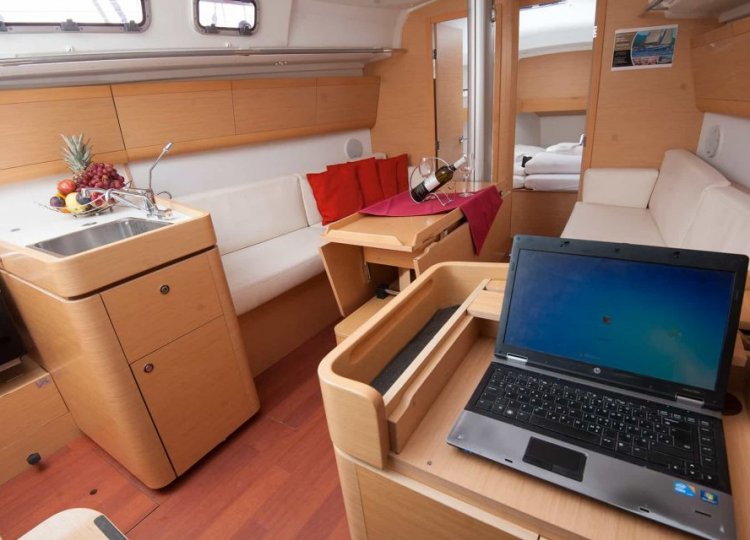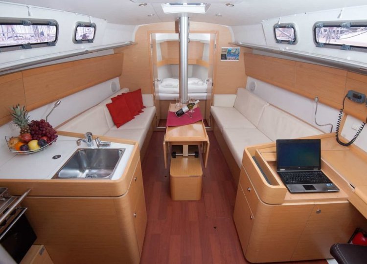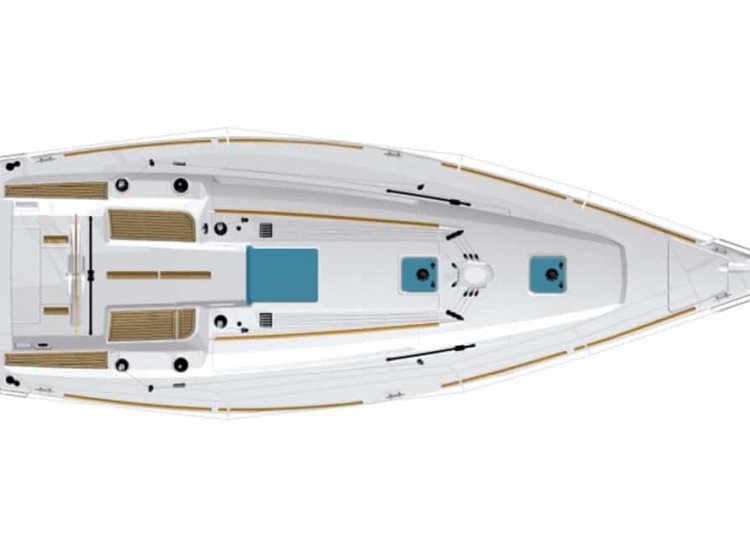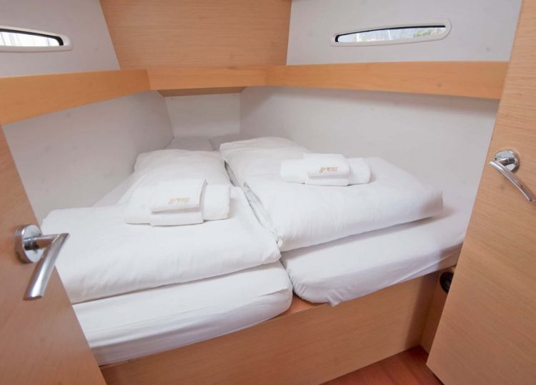 Zwei Segelbootkabinen mit zwei zusätzlichen Kojen im Salon eignen sich für kleinere Crews von 4 bis 6 Personen. Das Cockpit besticht durch sein elegantes Design. Die voll ausgestattete Küche enthält einen Gasherd und Backofen sowie einen 120-Liter-Kühlschrank mit 12 V. Die Duschen haben automatische Pumpen und natürlich heißes Wasser. Jede Kabine wird unabhängig beheizt.