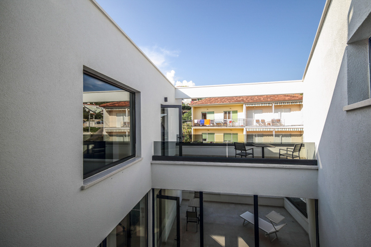 Es bietet Platz für bis zu 14 Personen, verfügt über 7 Schlafzimmer und 8 Badezimmer und eine Terrasse mit Blick auf das Meer,