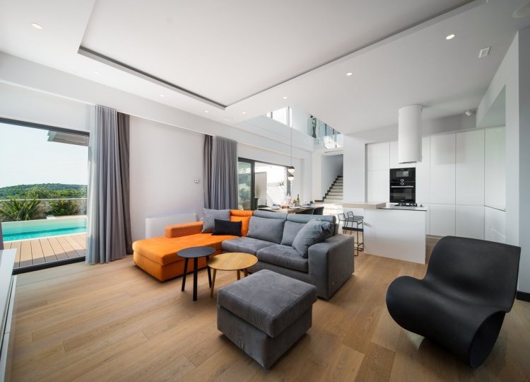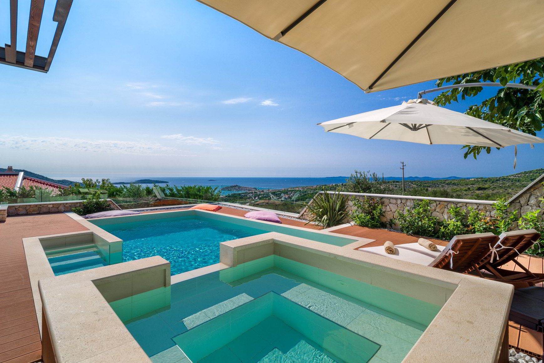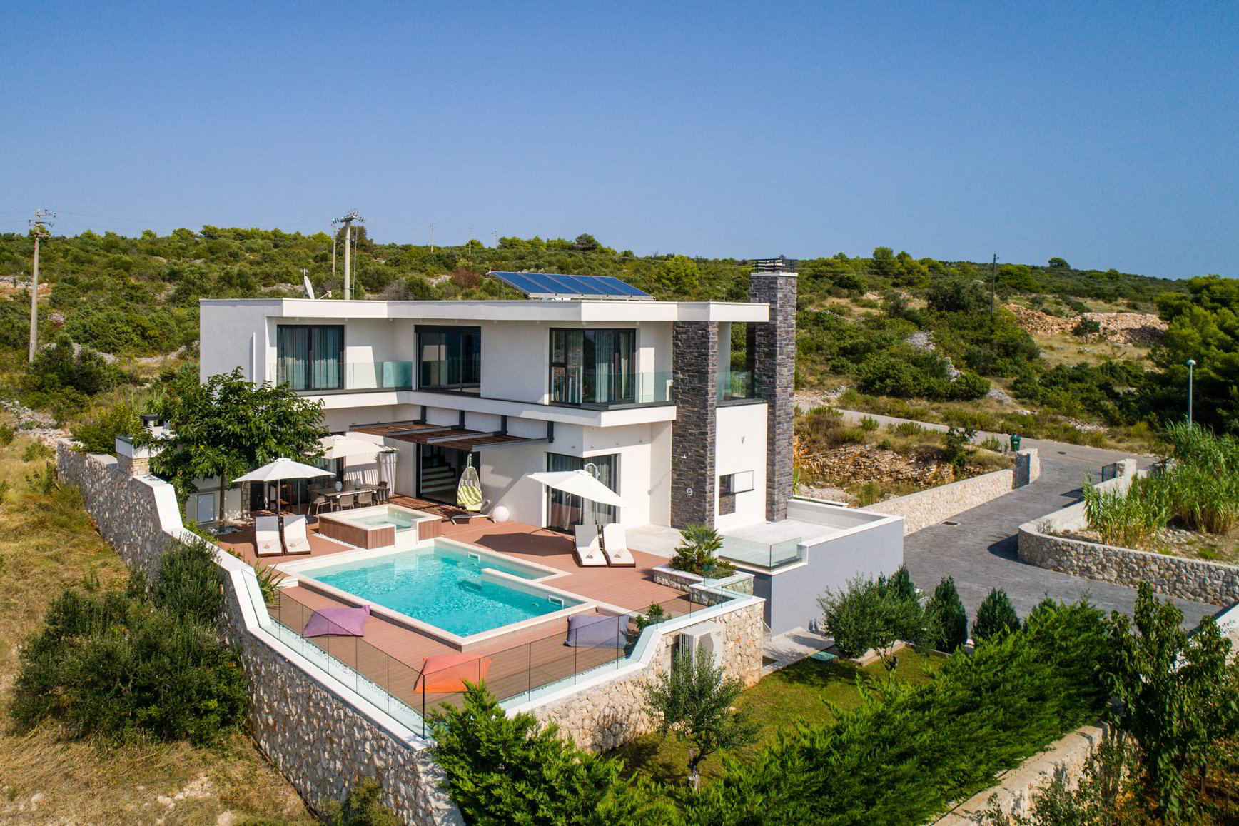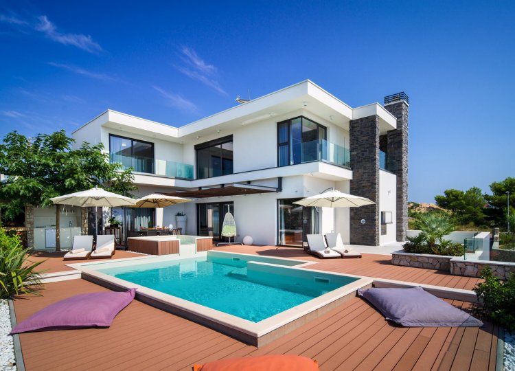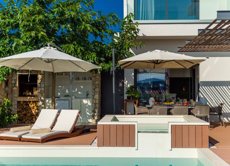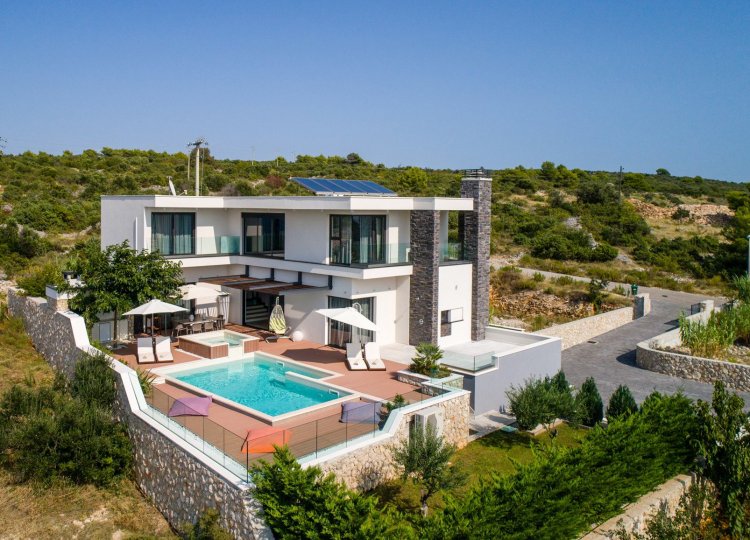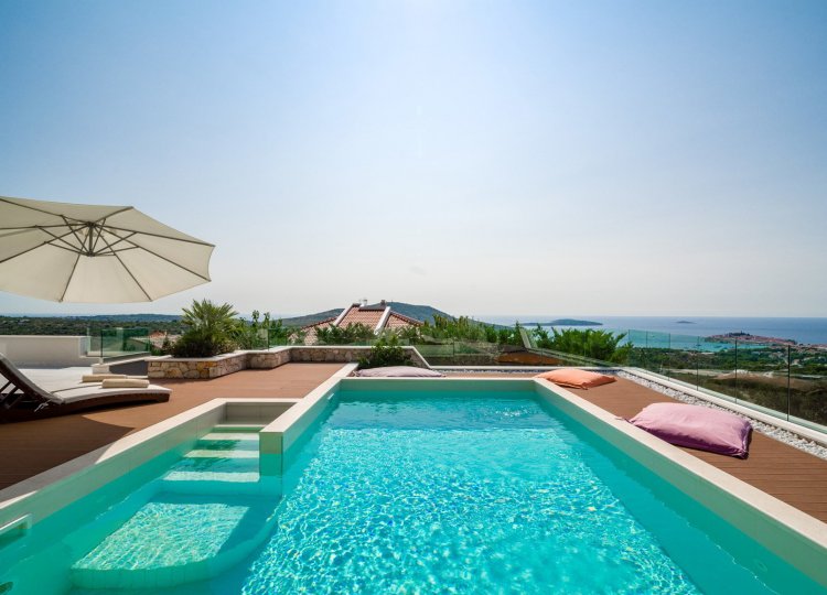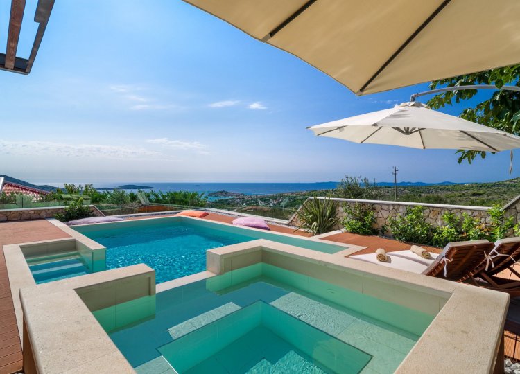 Diese klimatisierte Villa verfügt über 4 Schlafzimmer mit Doppelbetten und 4 Bäder mit Haartrockner, Dusche und Hydromassage-Badewanne. Jedes Schlafzimmer ist schallisoliert und verfügt über einen Flachbild-TV. Es verfügt über einen Essbereich und eine voll ausgestattete Küche sowie ein geräumiges Wohnzimmer mit Zugang zur Terrasse. Die Terrasse ist mit einem Grill, einem Essbereich und Liegestühlen für den Strand ausgestattet. Die Villa bietet einen beheizten Außenpool und einen Whirlpool mit Panoramablick auf Primosten und das offene Meer. Sat-TV und DVD-Player sind ebenfalls verfügbar, kostenfreies WLAN und kostenfreie Parkplätze.
