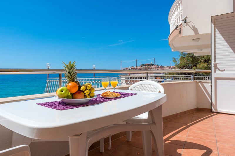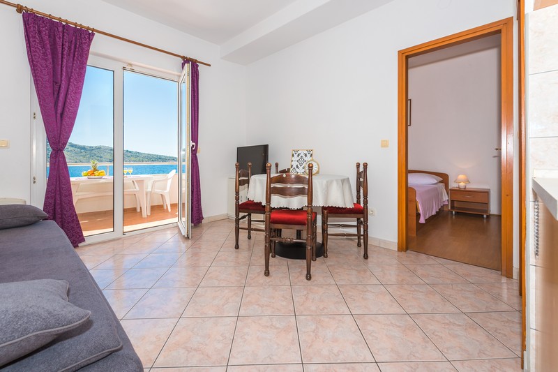 Apartment A1 of type 2+2 is located on the ground floor and consists of a bedroom, living room with sofa bed for two persons (160x200) kitchen, bathroom and balcony with sea view. The kitchen has a stove without oven and is equipped with cooking and serving dishes. It is suitable for families with smaller children. Since it is located on the ground floor and has no stairs, it is also suitable for older people.