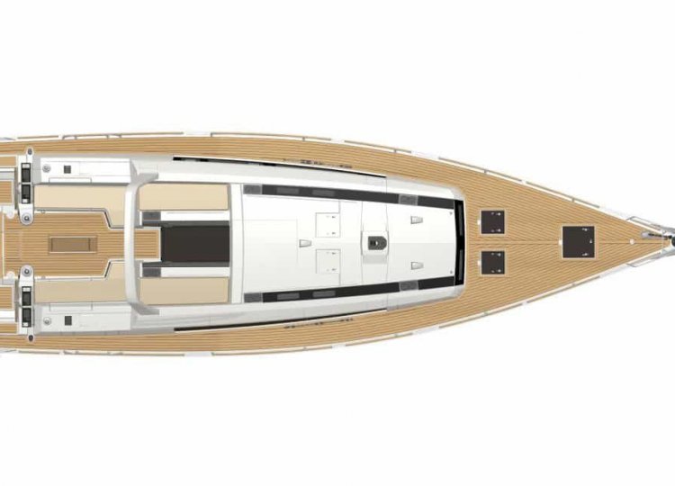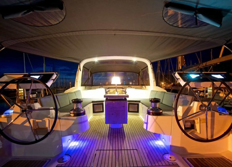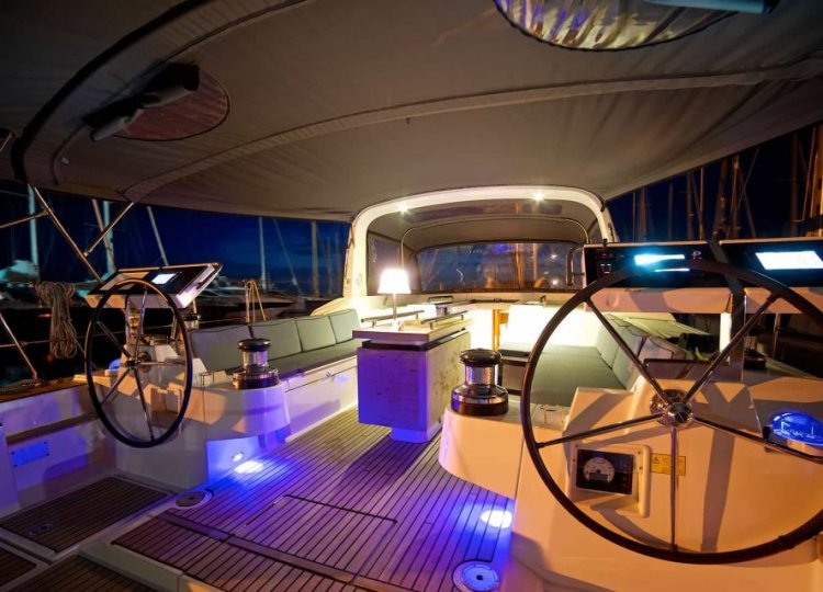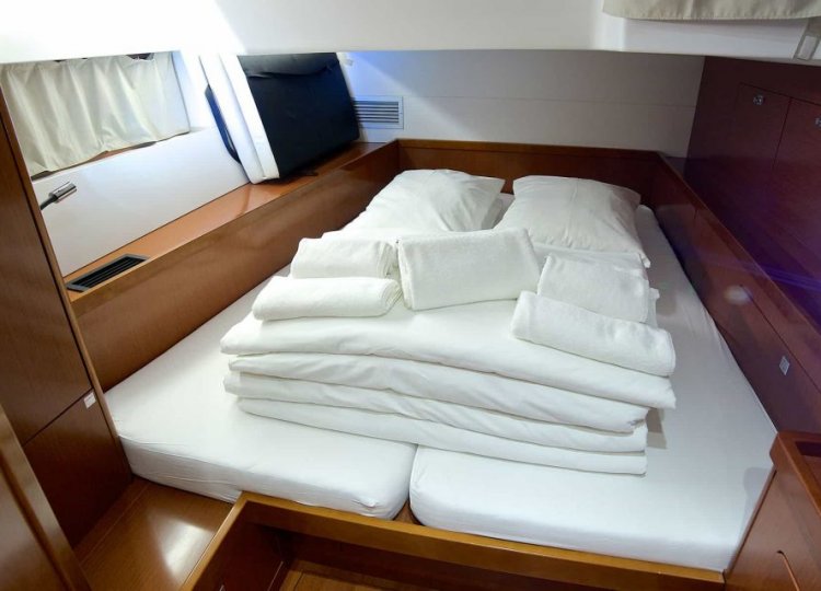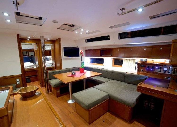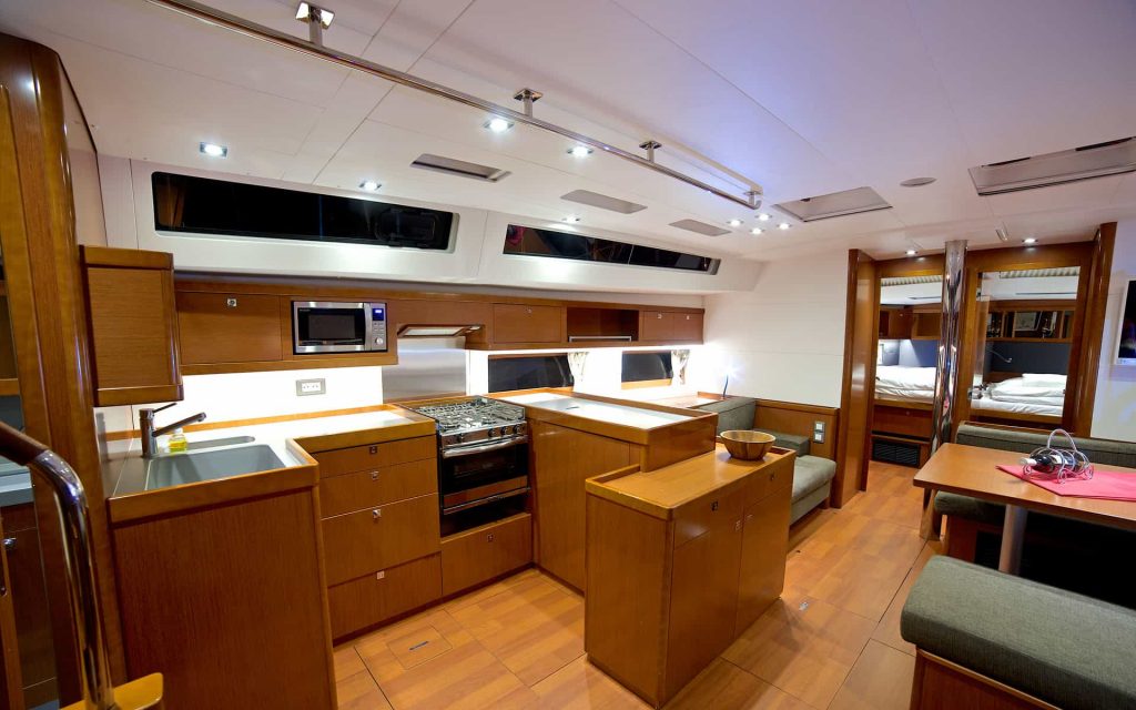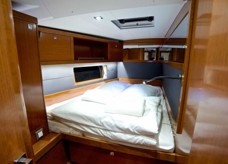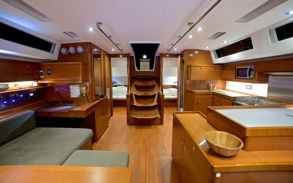 Interijer karakteriziraju mnogi otvori koji čine svježu, svijetlu i prostranu kuhinju, dobro opremljenu dizajnerskim inovacijama, gostoljubivom i ultra udobnom. Četiri glavne kabine plus skiperska kabina, svaka sa svojom kupaonicom, daju osjećaj spokoja, hladnoće i tišine. Posebne pozivnice za opuštanje su četiri velika sunčališta zajedno sa stražnjom platformom koja se pretvara u terasu na rubu vode.