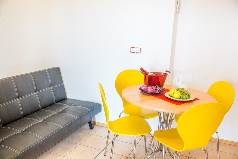 65m²; dvije spavaće sobe od kojih jedna sadrži bračni kreveta, a druga dva kreveta za po jednu osobi koji su spojivi u jedan veliki; kuhinja s blagovaonicom i dnevnim boravkom s kaučem za rasklapanje, kupaonica s WC-om, balkon, klima uređaj, Sat-TV, wi-fi, prvi kat, parkirno mjesto