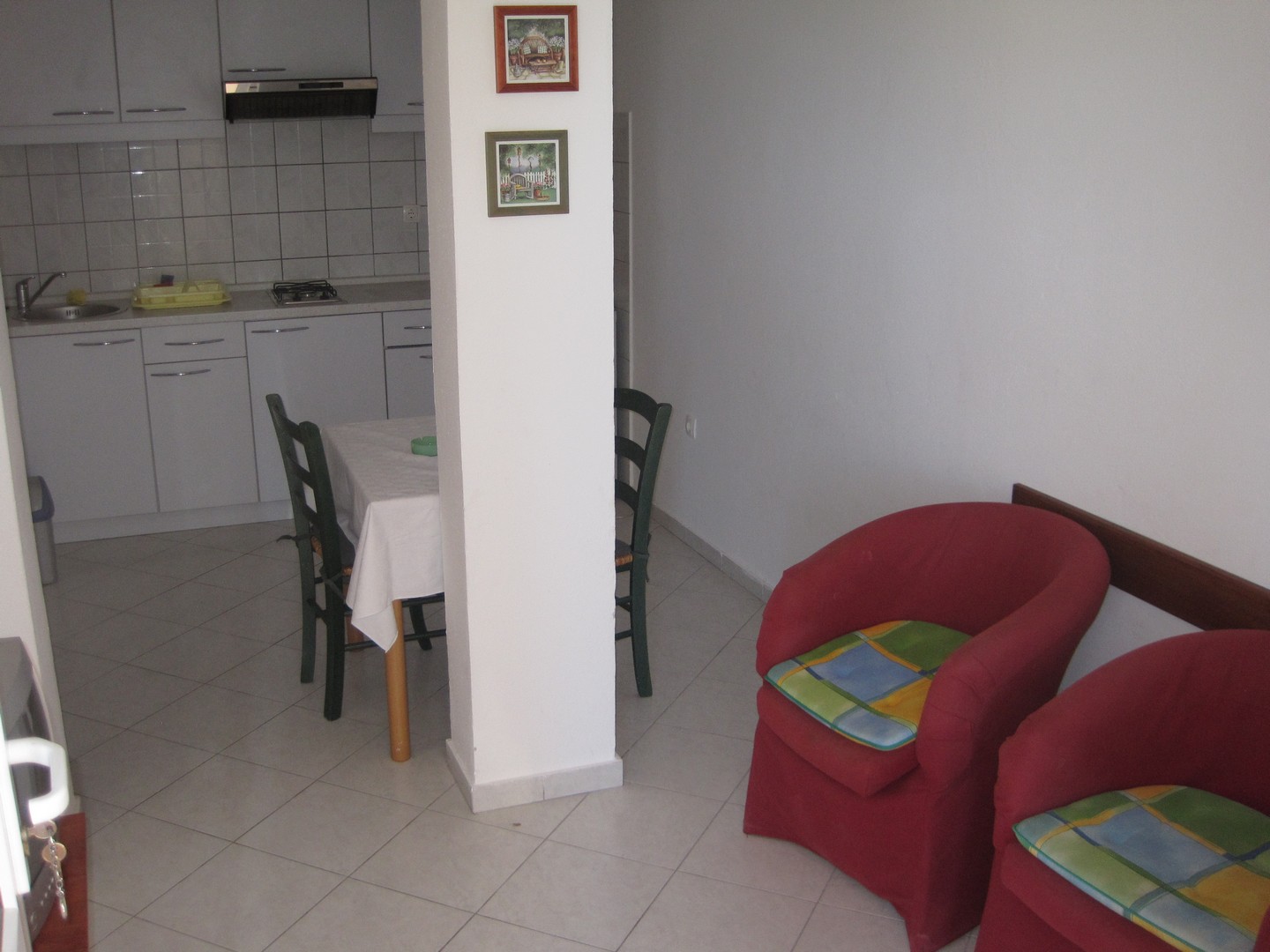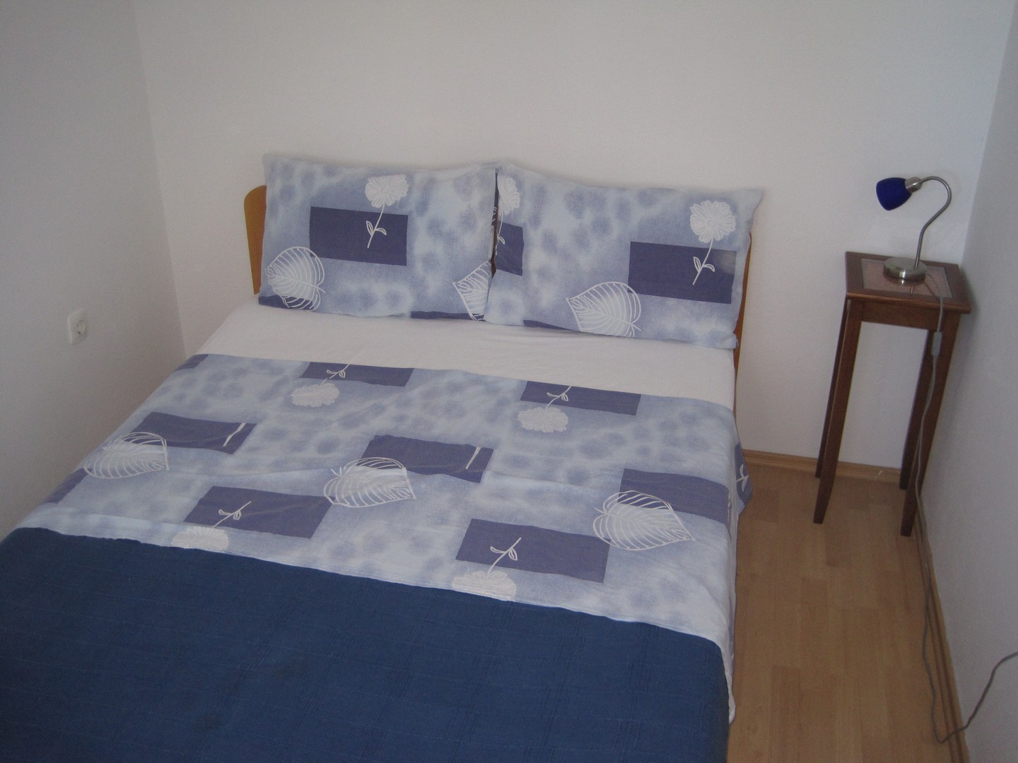 cca 400 m od mora i plaže i cca 400 m od centra, terasa sa malim pogledom na more, kuhinja, soba sa bračnim krevetom, WC-kupatilo, klima, TV, Wi-Fi, prizemlje, parking