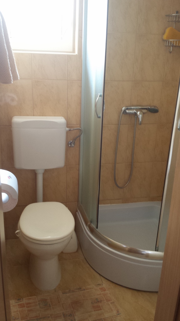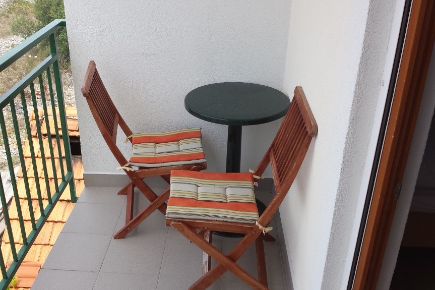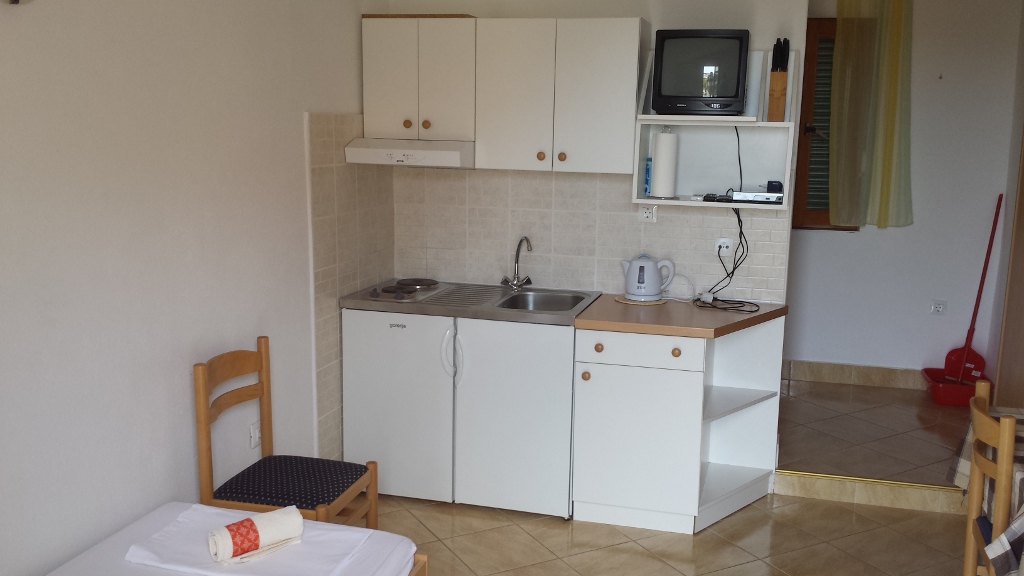 cca 400 m od mora i plaže i cca 500 m od centra, balkon sa malim pogledom na more, dva kreveta za po jednu osobu (spojivi u bračni krevet), kuhinja, WC-kupatilo, TV, klima, wi-fi, prizemlje, parking