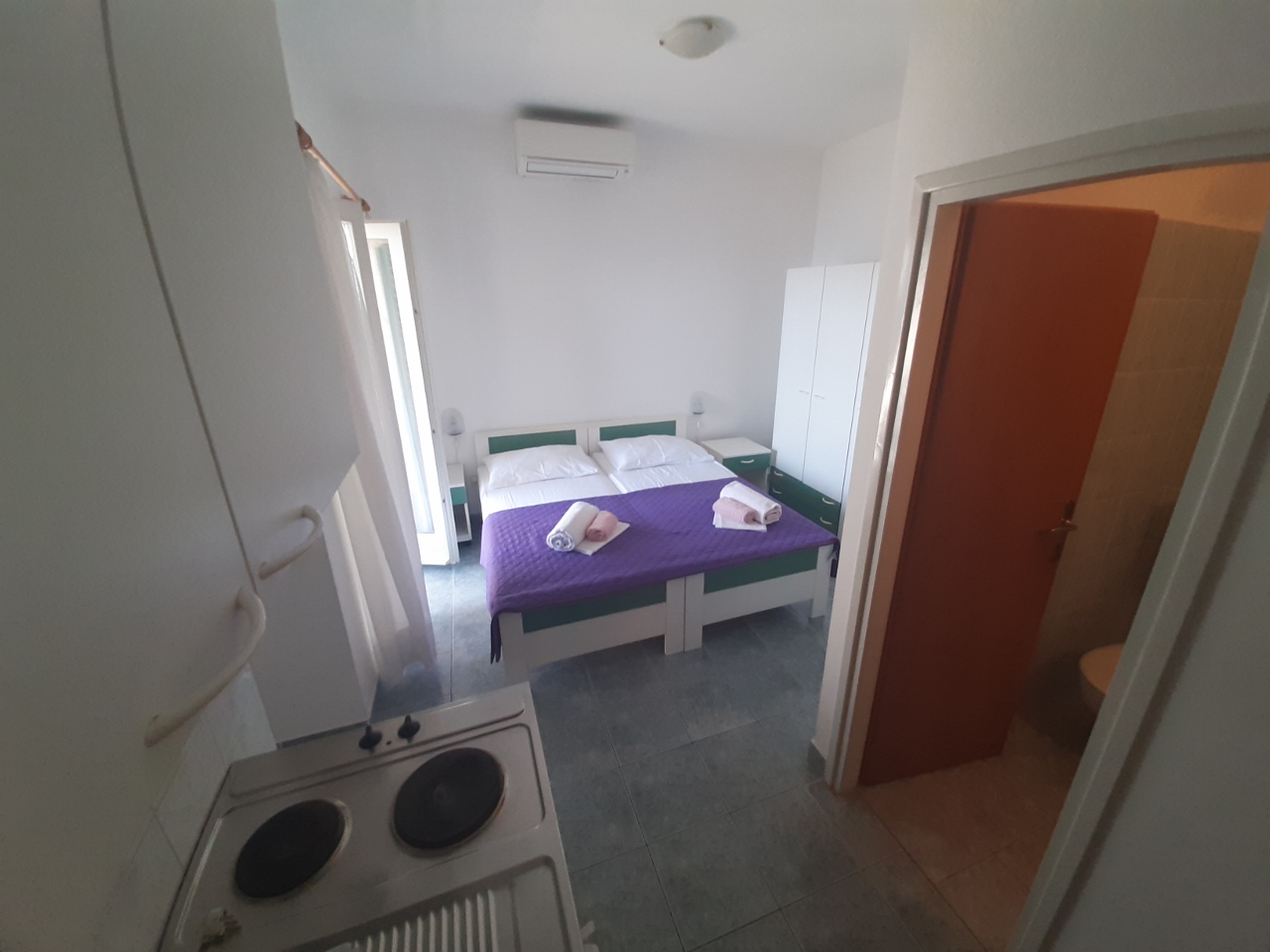 Odvojena spavaća soba s bračnim krevetom, kuhinja s blagovaonicom, kupaonica s WC-om, terasa, klima uređaj, TV, wi-fi, vanjski roštilj, prizemlje, parkirno mjesto