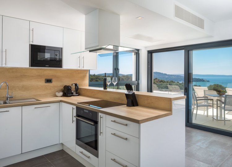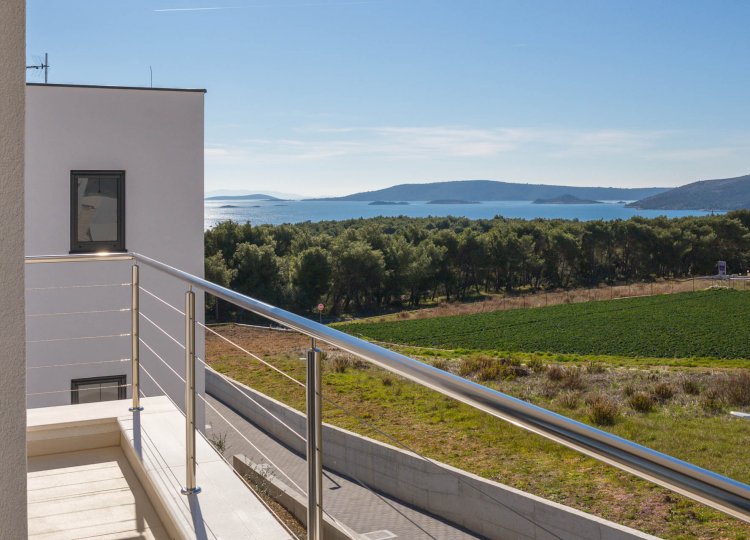 Luksuzno opremljeni penthouse apartman na drugom katu sa prekrasnim pogledom na more te sa odvojenim pristupom liftu i zajedničkim korištenjem vanjskog bazena sa druga dva apartmana. Udaljen cca 3 km od centra grada Trogira i cca 30 km do grada Splita.
