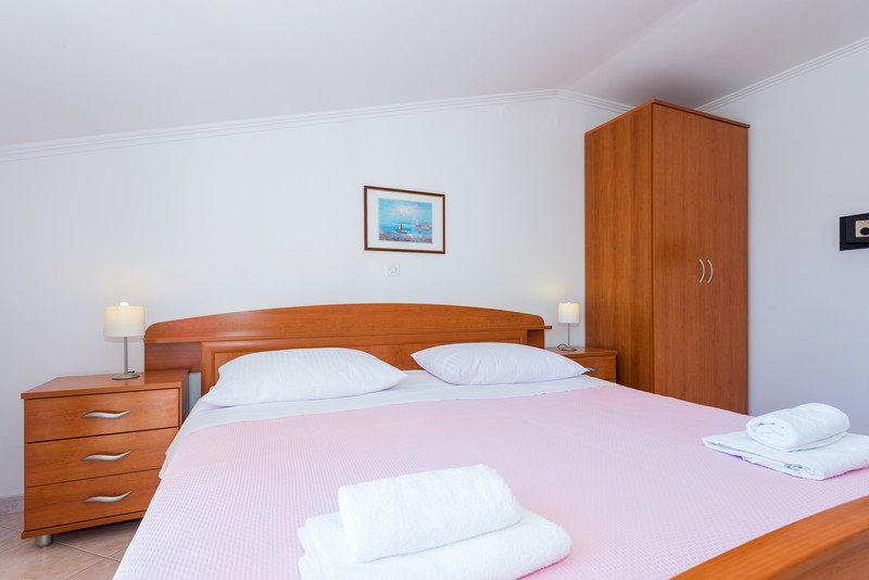 Pokój dwuosobowy o powierzchni 18 m² znajduje się na trzecim piętrze. Jest to pokój z łazienką i balkonem z widokiem na morze. Pokój wyposażony jest w lodówkę, czajnik elektryczny i odpowiednie naczynia.