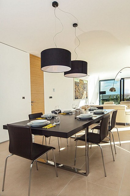 Salon / jadalnia (49 m2) z TV T / LCD, otwiera się na taras (27 m2, częściowy widok na morze). Otwarta kuchnia (4-palnikowa płyta ceramiczna, piekarnik, zamrażarka, kuchenka mikrofalowa, zmywarka do naczyń). Oddzielna toaleta.