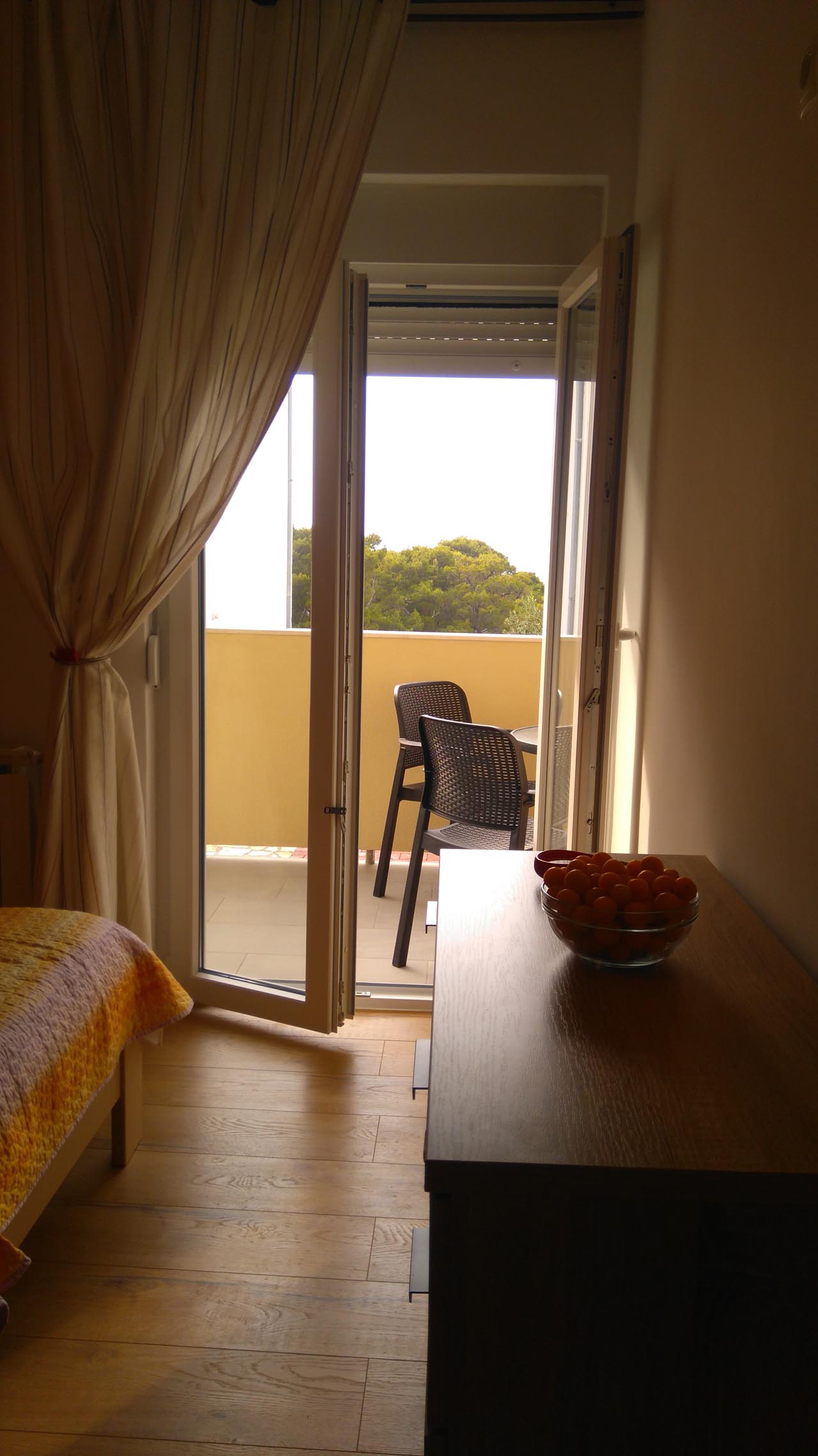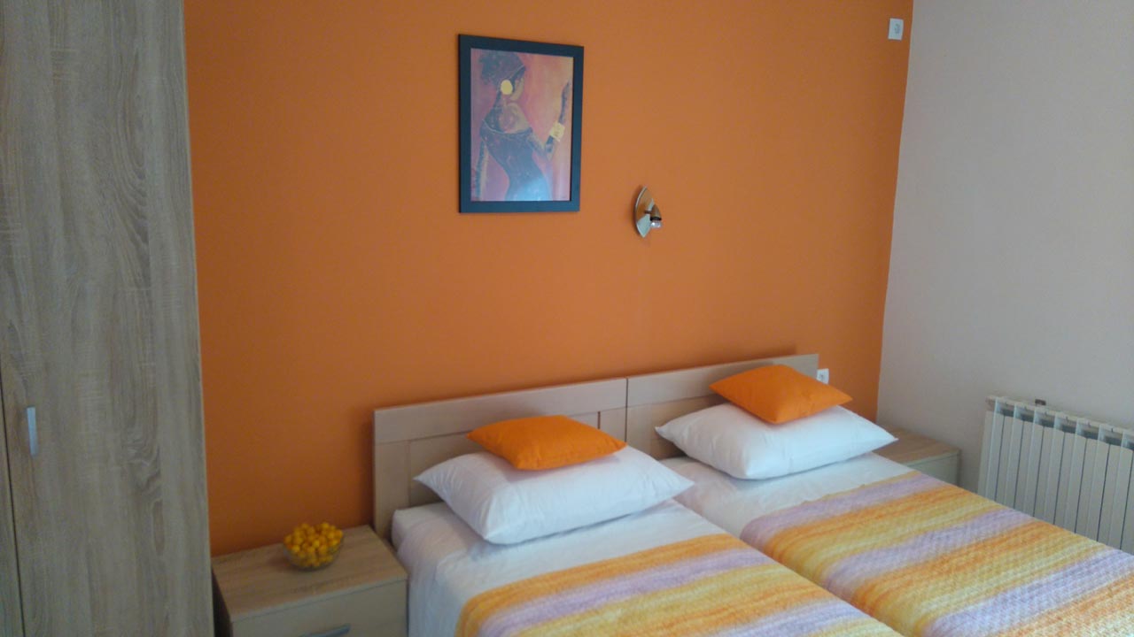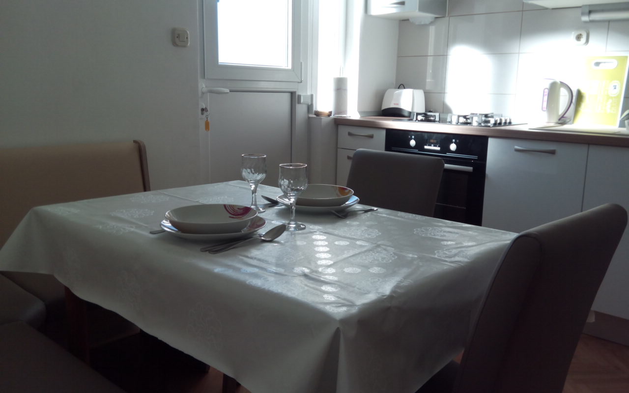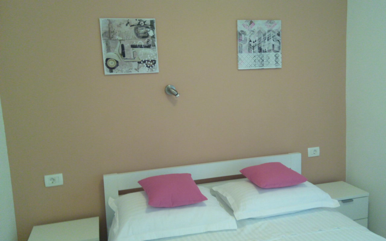 Dwie oddzielne sypialnie z podwójnymi łóżkami, pokój dzienny z rozkładaną sofą, kuchnia z jadalnią, łazienka z WC, dwa balkony, klimatyzacja, TV, WiFi, parter, parking