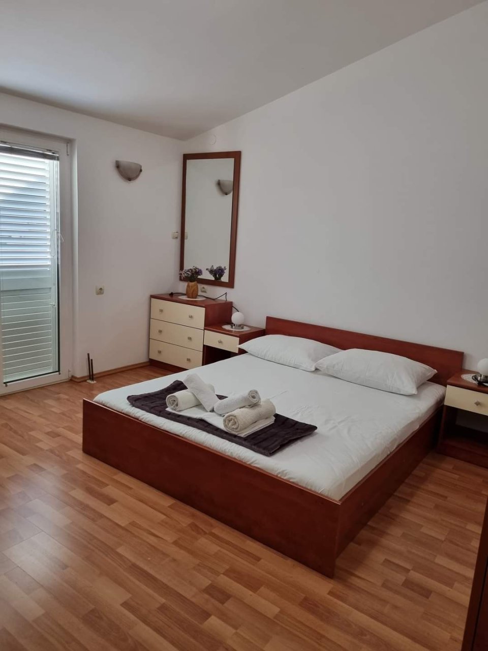 75 m²; dwie sypialnie z podwójnymi łóżkami, kuchnia z jadalnią i salonem z rozkładaną sofą, łazienka z WC, klimatyzacja, telewizja satelitarna, internet bezprzewodowy, drugie piętro, parking
